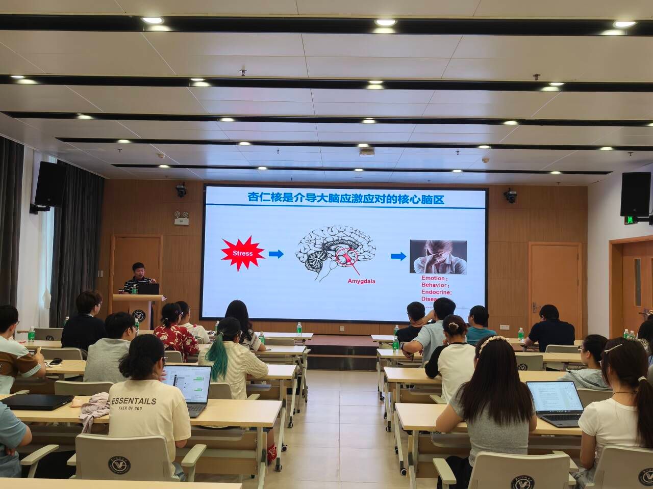 潘秉兴教授还展示了一系列实验数据和图表,生动地揭示了慢性应激如何通过选择性调控前额叶皮层对杏仁核特定类群神经元的支配,最终导致过度焦虑;以及慢性应激如何下调杏仁核内一类选择性位于突触外膜、并含δ亚基的GABAA受体(GABAA(δ)R)的表达与功能,从而引起焦虑障碍等。这些前沿研究内容让在场师生对杏仁核与应激应对的关系有了更深入、全面的认识。