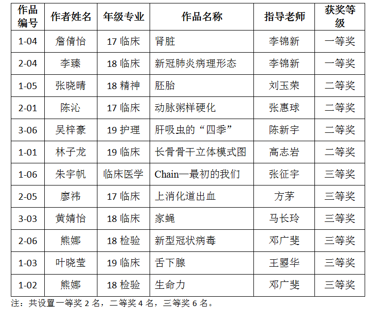 附件1:2020年首届大学生医学形态学绘图大赛获奖名单