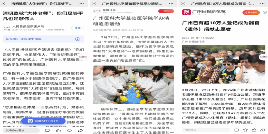 多家媒体报道:清明节举办的遗体捐献者缅怀纪念活动被人民日报、光明日报、广州日报、南方都市报、羊城晚报等主流媒体报道。