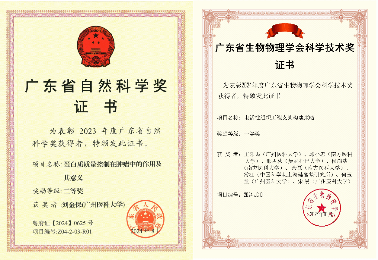 2项科学技术奖:刘金保教授团队获得广东省自然科学奖二等奖,王乐禹教授获得广东省生物物理学会科学技术奖一等奖。