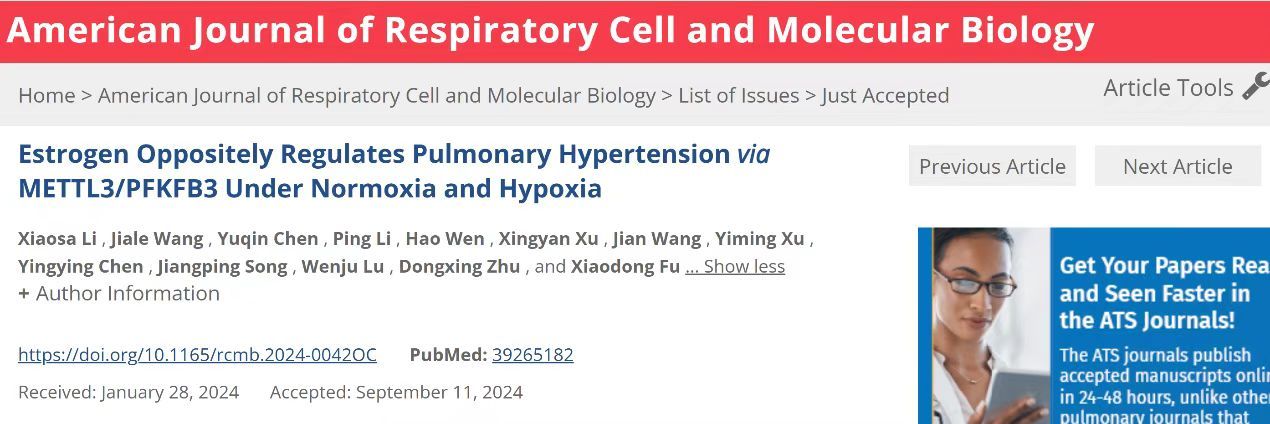 付晓东教授团队在American Journal of Respiratory Cell and Molecular Biology杂志上发表了题为“Estrogen oppositely regulates pulmonary hypertension via METTL3/PFKFB3 under normoxia and hypoxia”的文章。研究发现,在常氧和低氧的不同条件下,雌激素可通过反向调节肺血管平滑肌细胞中METTL3/PFKFB3蛋白水平进而逆向调控肺动脉高压的发生。