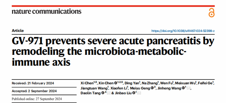 刘金保教授团队在Nature Communications上发表了题为“GV-971 prevents severe acute pancreatitis by remodeling the microbiota-metabolic-immune axis”的文章,该研究在重症急性胰腺炎小鼠模型中发现GV-971可通过重塑肠道菌群-代谢-免疫轴阻断急性胰腺炎重症化。
