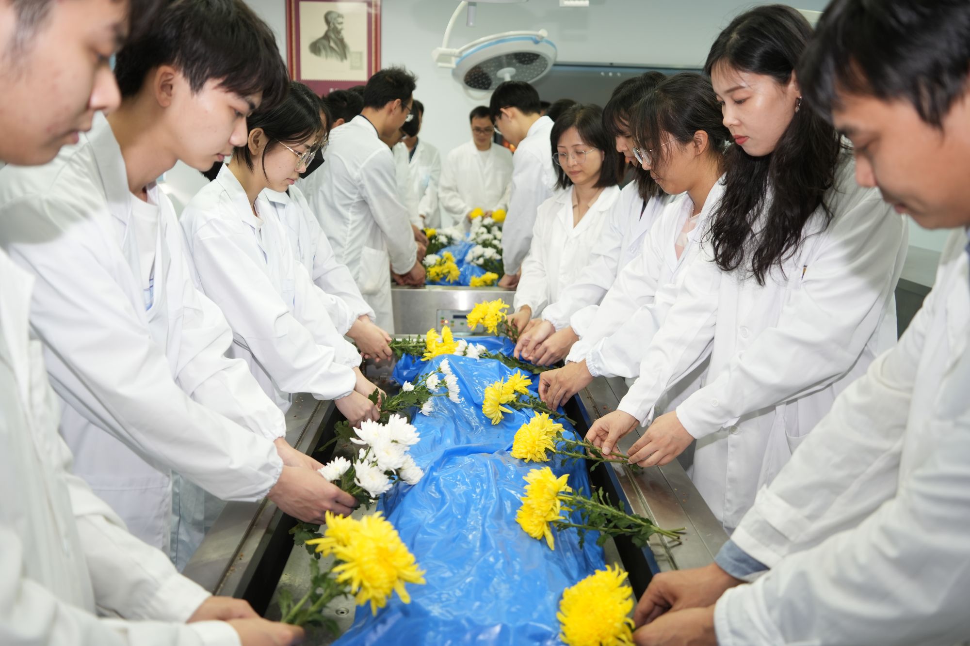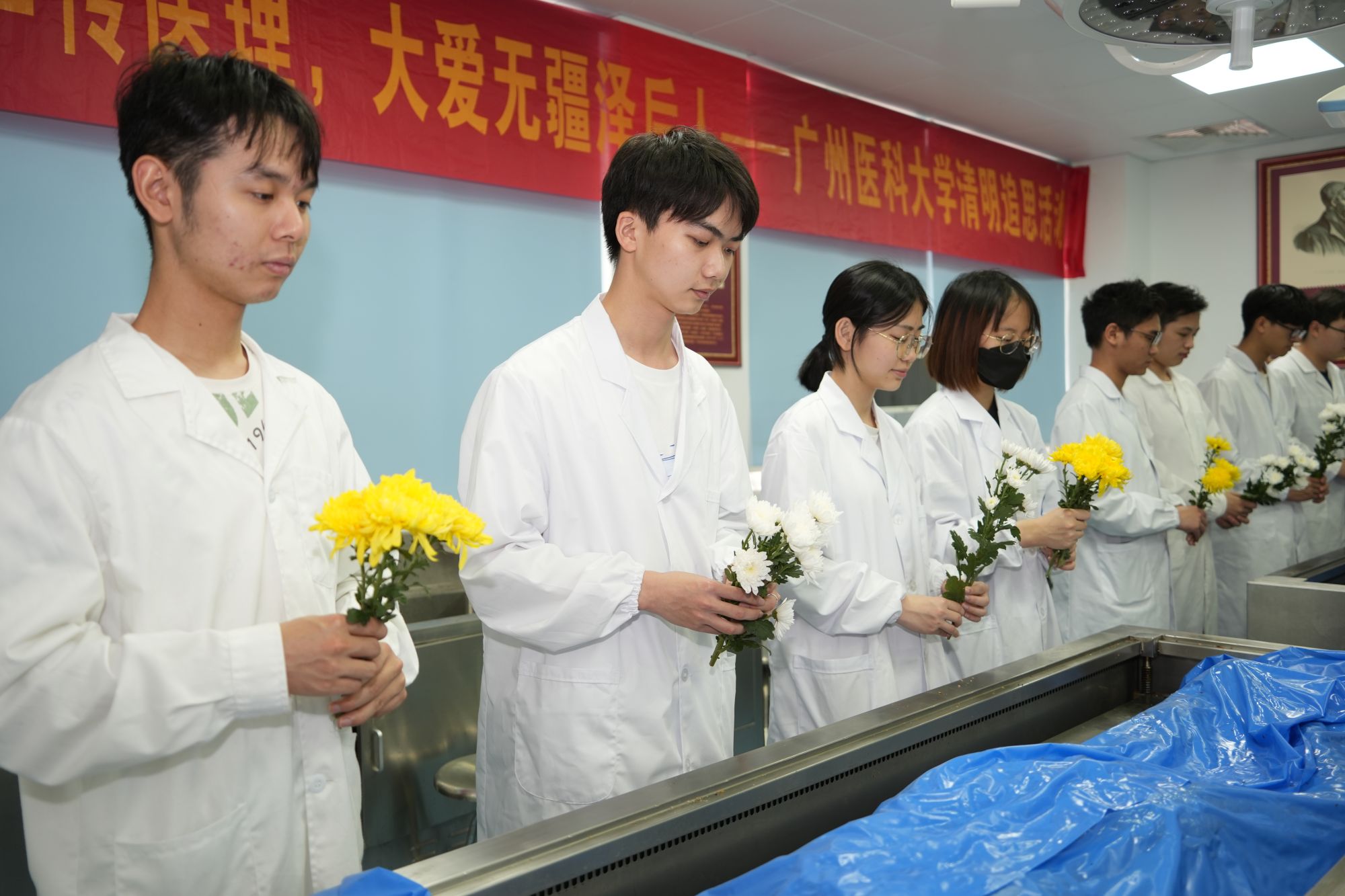3月27日,色色啦 举办以“生命升华传医理,大爱无疆泽后人”为主题的清明追思活动,缅怀为医学事业无私奉献的“大体老师”--遗体捐献者。师生们手握雏菊,静默肃立,将敬意献给让生命发出最后一束光的“无言恩师”们。