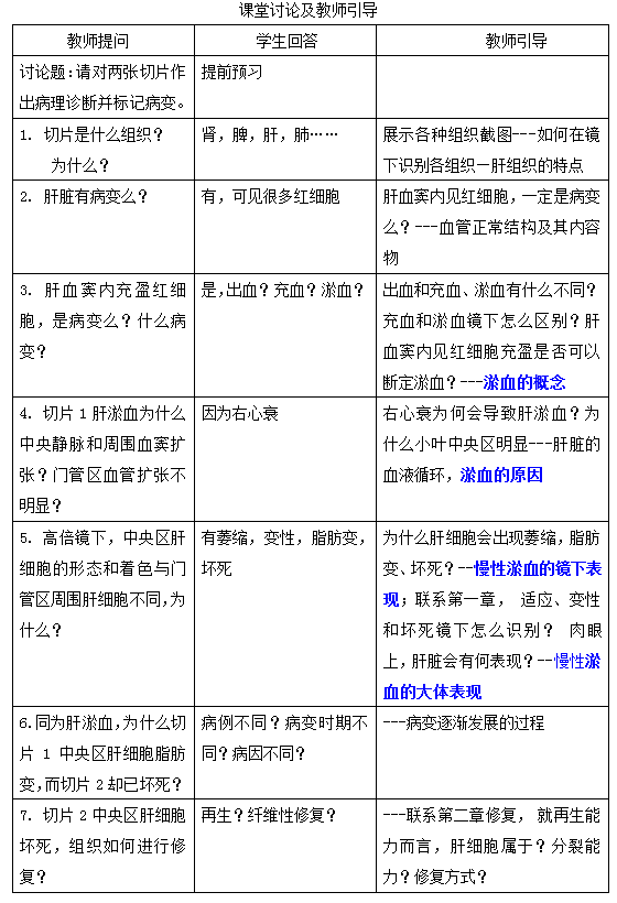 讨论主题的设置成为了教师备课的重头戏。以《局部血液循环障碍》第一次课为例,教学内容为水肿、出血、充血和淤血。考虑到淤血是本节的重点内容,且镜下表现有淤血性水肿和淤血性出血,在讨论中可与充血、水肿、出血发生关联,因此确定讨论主题为淤血,然后以病变较为典型的肝淤血作为切入点,截取数字图片6张制作PPT,并提出问题: