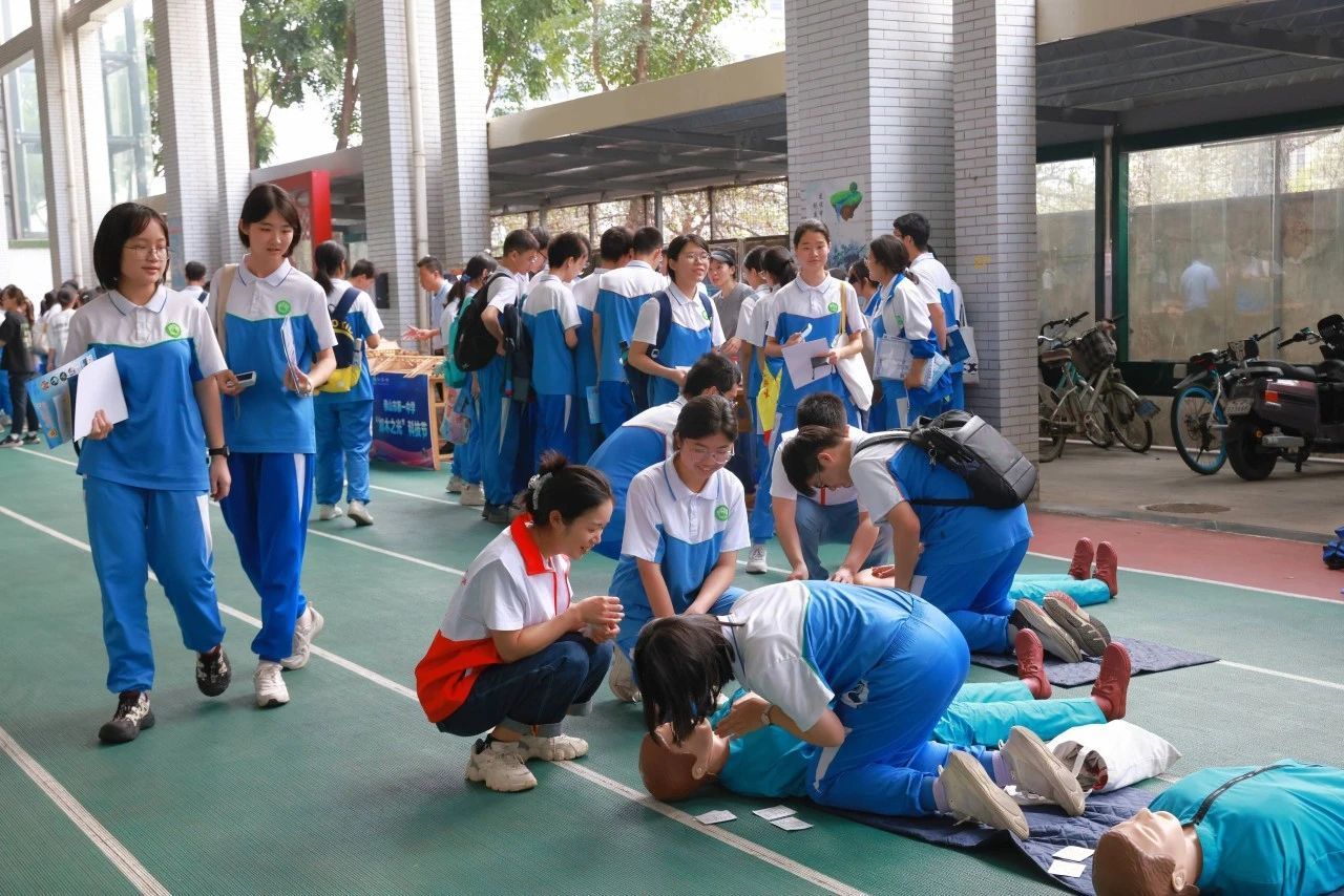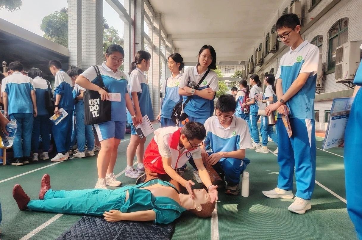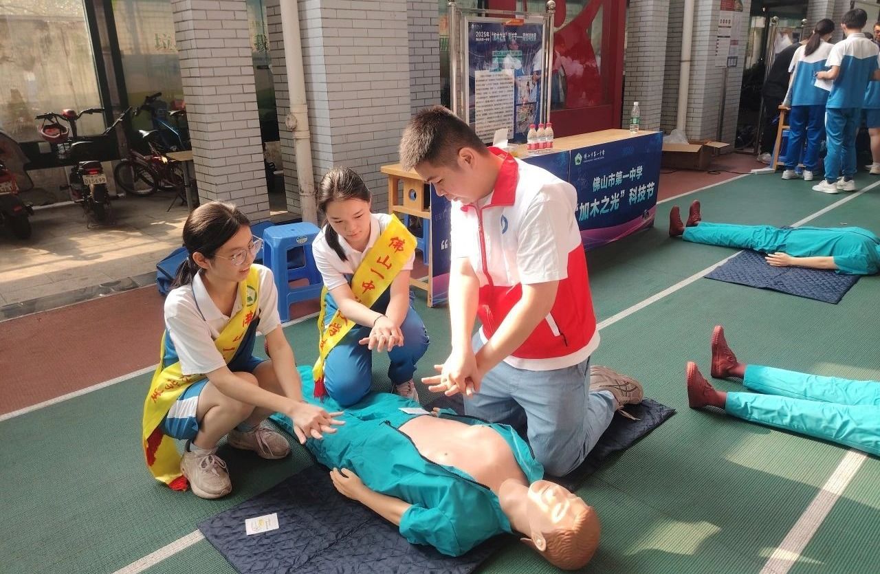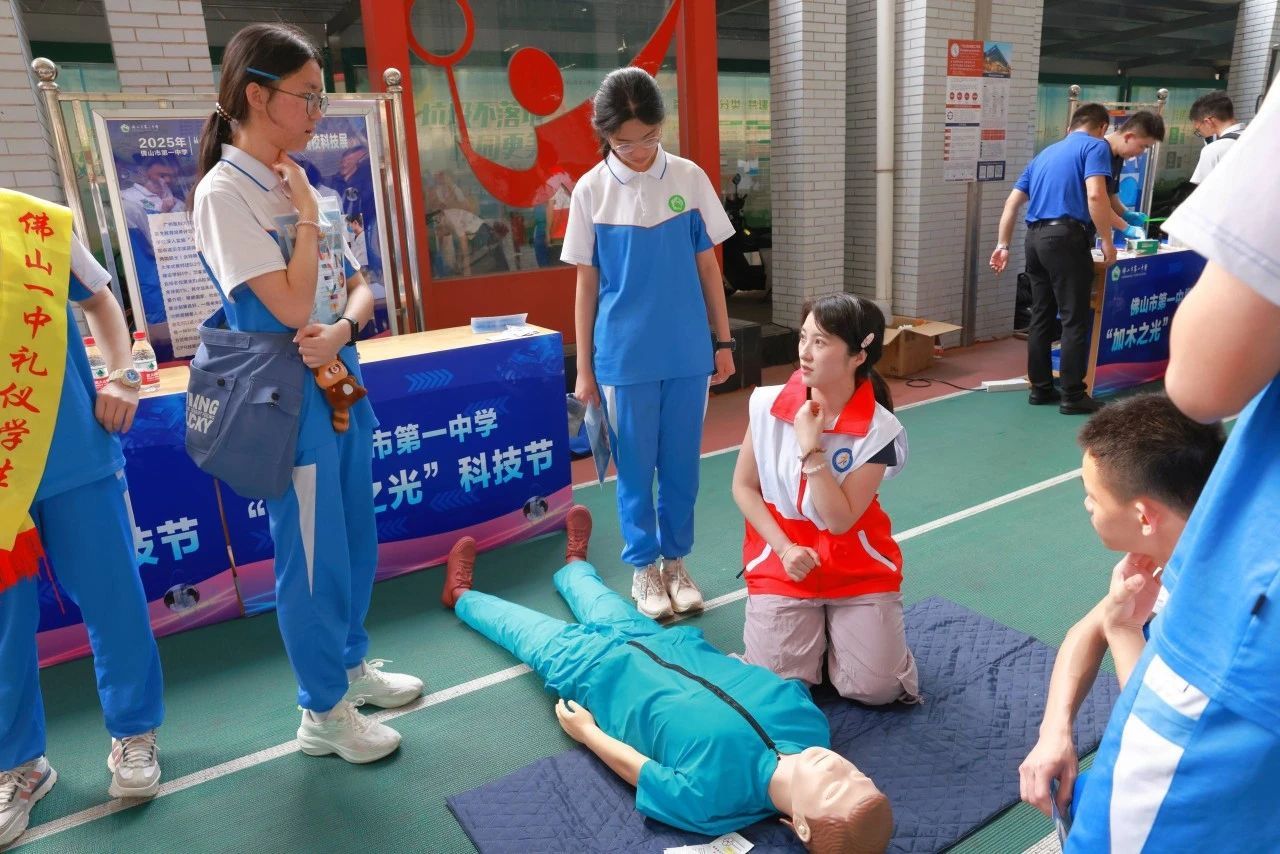 在实操训练阶段,60多名佛山一中的学生参与了模拟人体练习。科普团队采取“手把手指导+实时反馈”的教学模式,针对按压姿势、施救节奏等关键环节进行纠正。现场“手臂打直”、“01、02、03”的指导声此起彼伏,形成沉浸式学习场景。完成5个循环操作后,不少同学感慨,看似简单的动作实则需要充沛体力与高度专注,在亲身体验中既感受到医学专业的严谨性,更领悟到生命守护的重要意义。