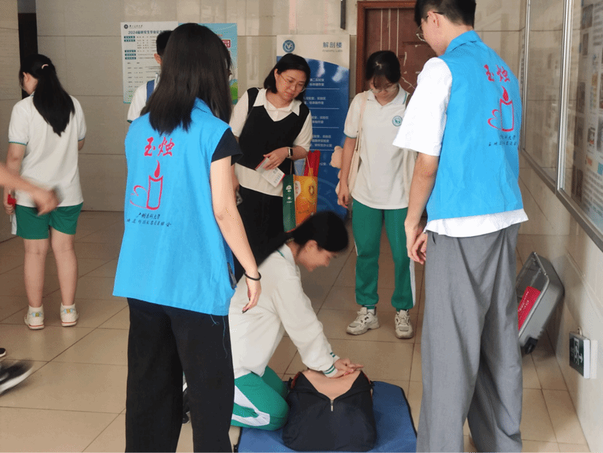 此次科普活动还为同学们耐心讲解心肺复苏的知识,规范展示心肺复苏的动作,并协助同学们亲身体验心肺复苏的实操。
