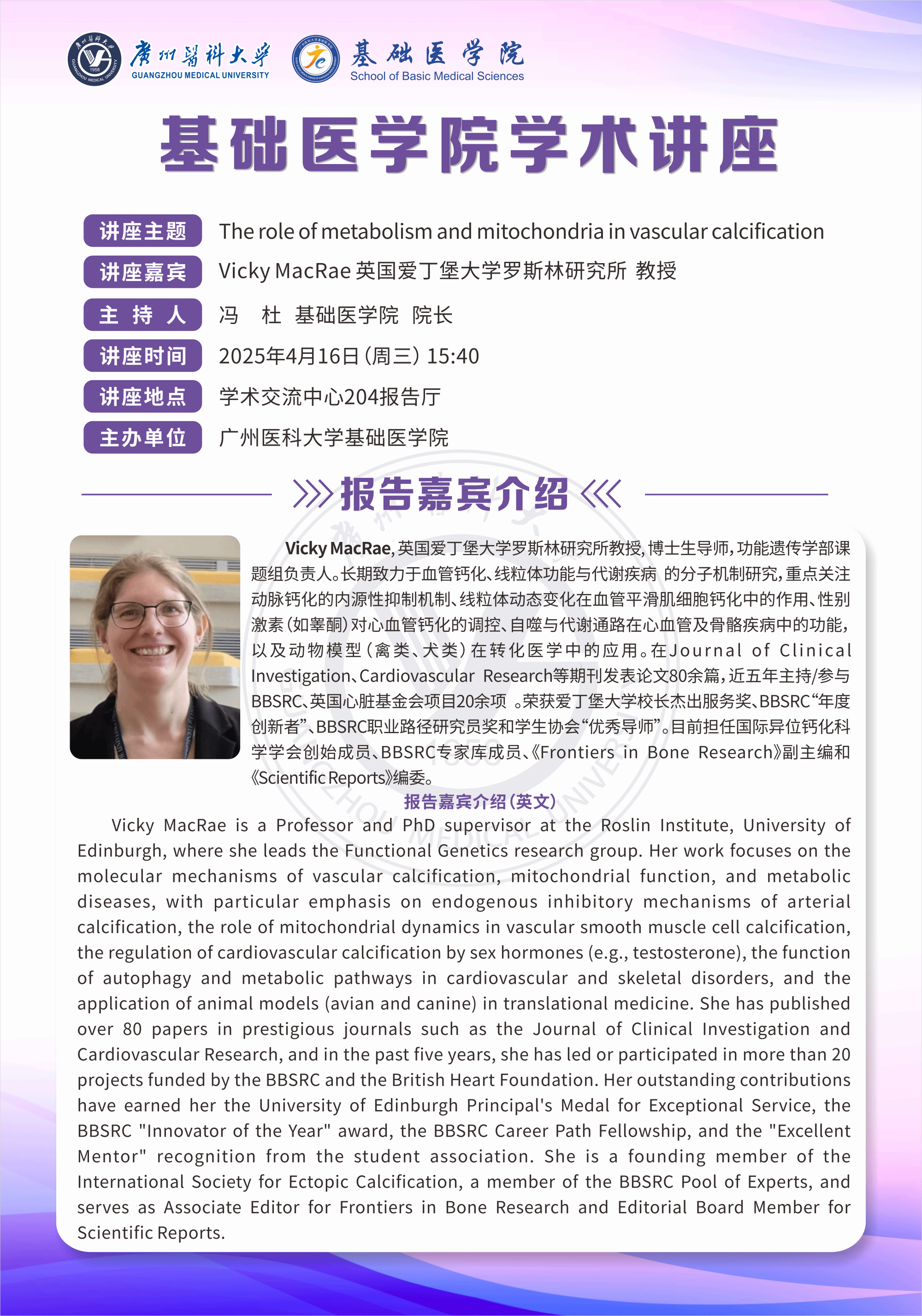 ◾讲座主题:The role of metabolism and mitochondria in vascular calcification(代谢与线粒体在血管钙化中的作用)