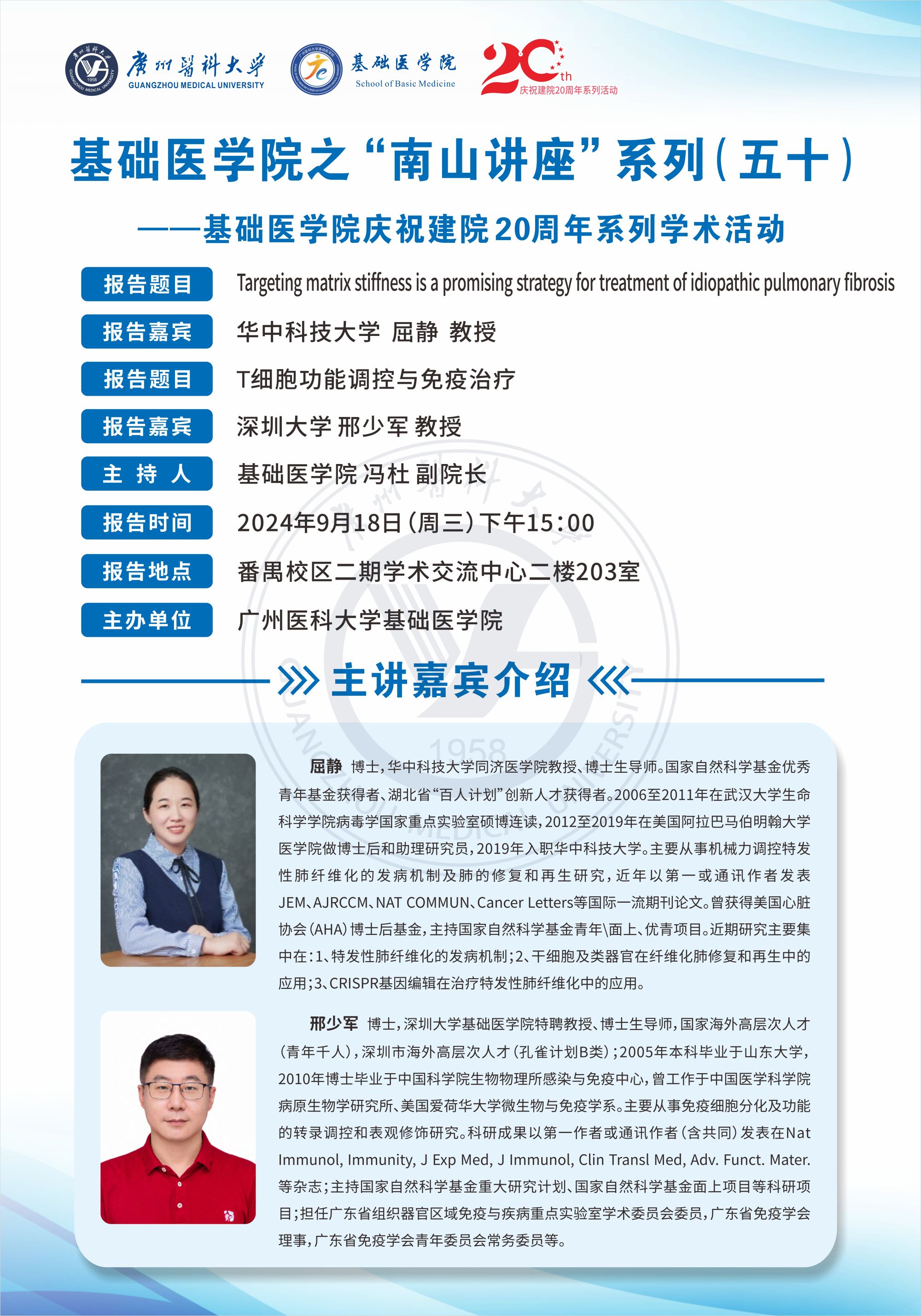 学术讲座——Targeting matrix stiffness is a promising strategy for treatment of idiopathic pulmonary fibrosis;T细胞功能调控与免疫治疗